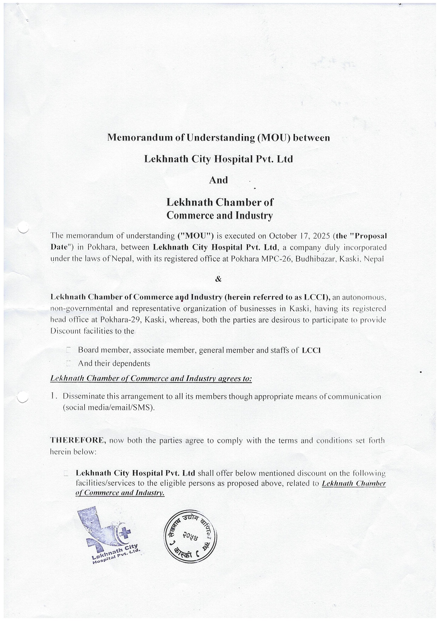 यस सम्बन्धी सहमति पत्रमा लेखनाथ उद्योग वाणिज्य संघकी अध्यक्ष जानुका पराजुली अधिकारीलेखनाथ सिटी हस्पिटल प्रा.लि.का अध्यक्ष आकाश बस्नेत बीच आज मिति २०८२ साल असोज ३१ गते हस्ताक्षर गरिएको छ।